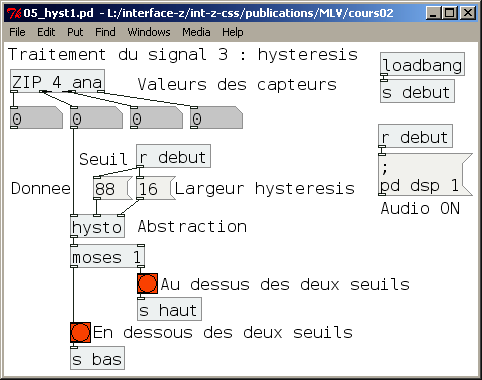 Cette abstraction reçoit sur l'entrée de gauche le flux de valeurs à comparer. L'entrée du milieu correspond au seuil moyen que l'on veut fixer. L'entrée de droite donne une largeur autour de ce seuil, permettant de créer un seuil haut et un seuil bas.
